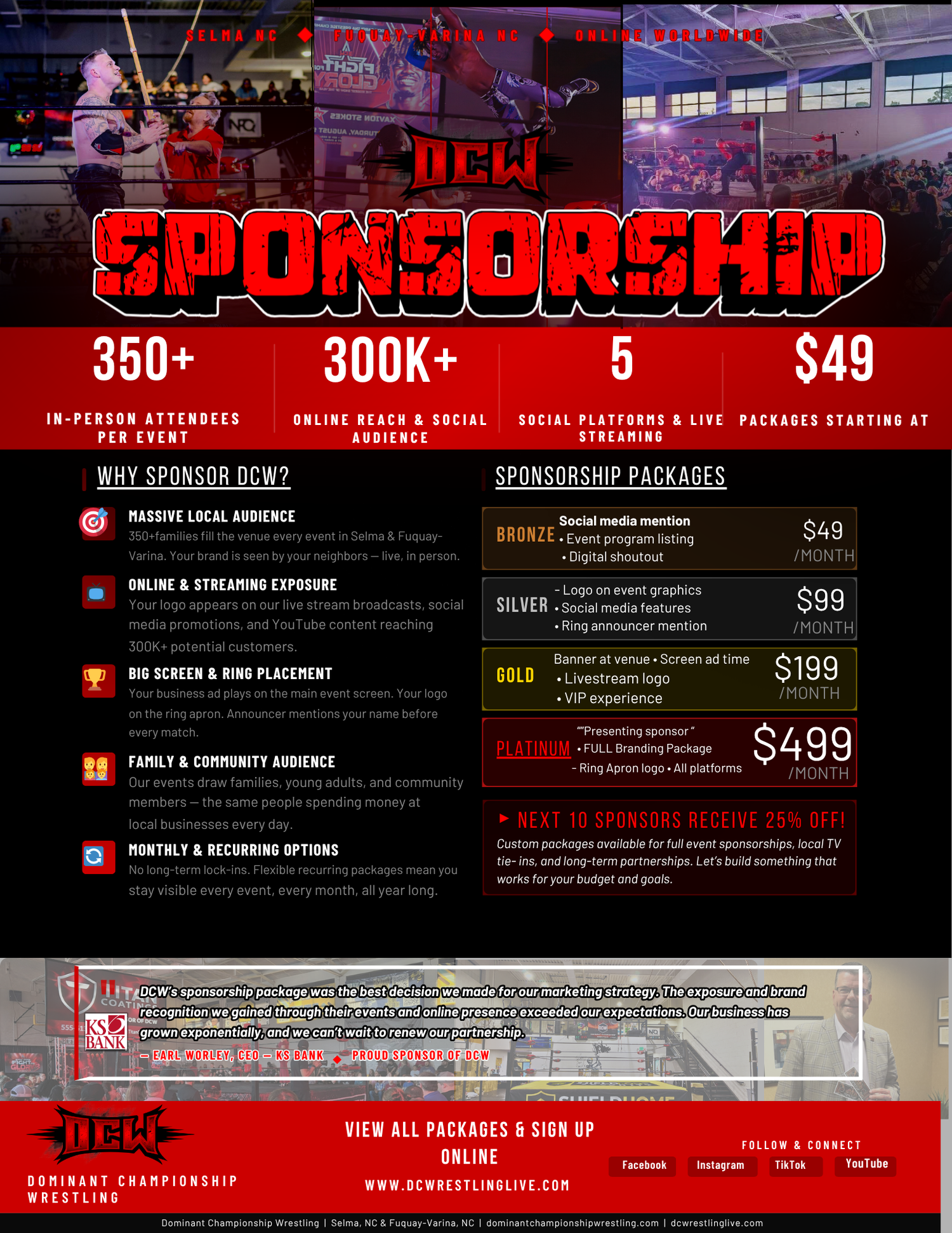 ✅Sponsor Dominant Championship Wrestling and put your business in front of 350+ in-person attendees and 300K+ online viewers every event.
